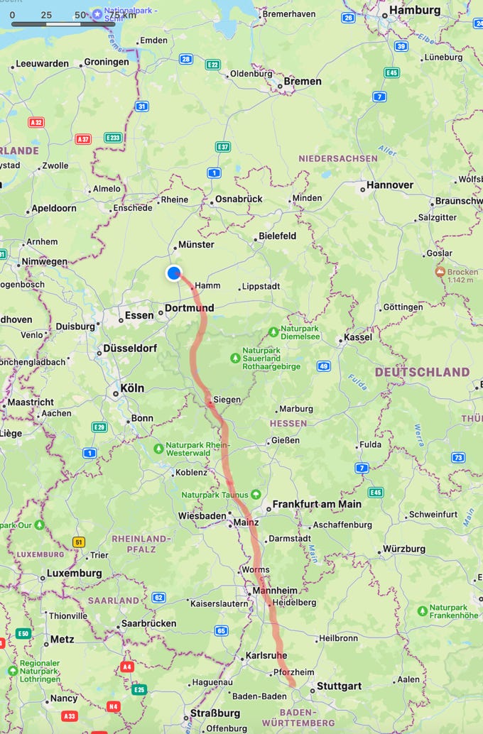 Der eher anstrengende als schöne erste Anreisetag geht im Münsterland zu Ende, bevor morgen die restlichen 260 km bis Emden anstehen. Heute waren es auf jeden Fall schon mal schon 465 km, 400 davon auf Landstraßen.