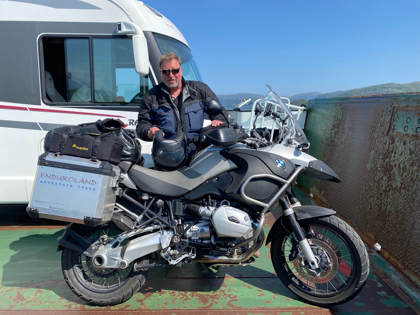 Und dann entspinnt sich ein sehr angenehmes Gespräch mit Gavin, wie ich später erfahre, der selbst Biker ist, aus Irland kommt und mit seiner Frau hier Urlaub macht. Wir verstehen uns auf Anhieb bestens. Gavin will alles über Enduroland wissen und verspricht, sich meine Website (auf der im Impressum meine Email Adresse steht) und den Blog, anzuschauen. Und tatsächlich bekomme ich am nächsten Tag eine Email von Gavin mit dem Foto, das er auf der Fähre von mir gemacht hat. An dieser Stelle: